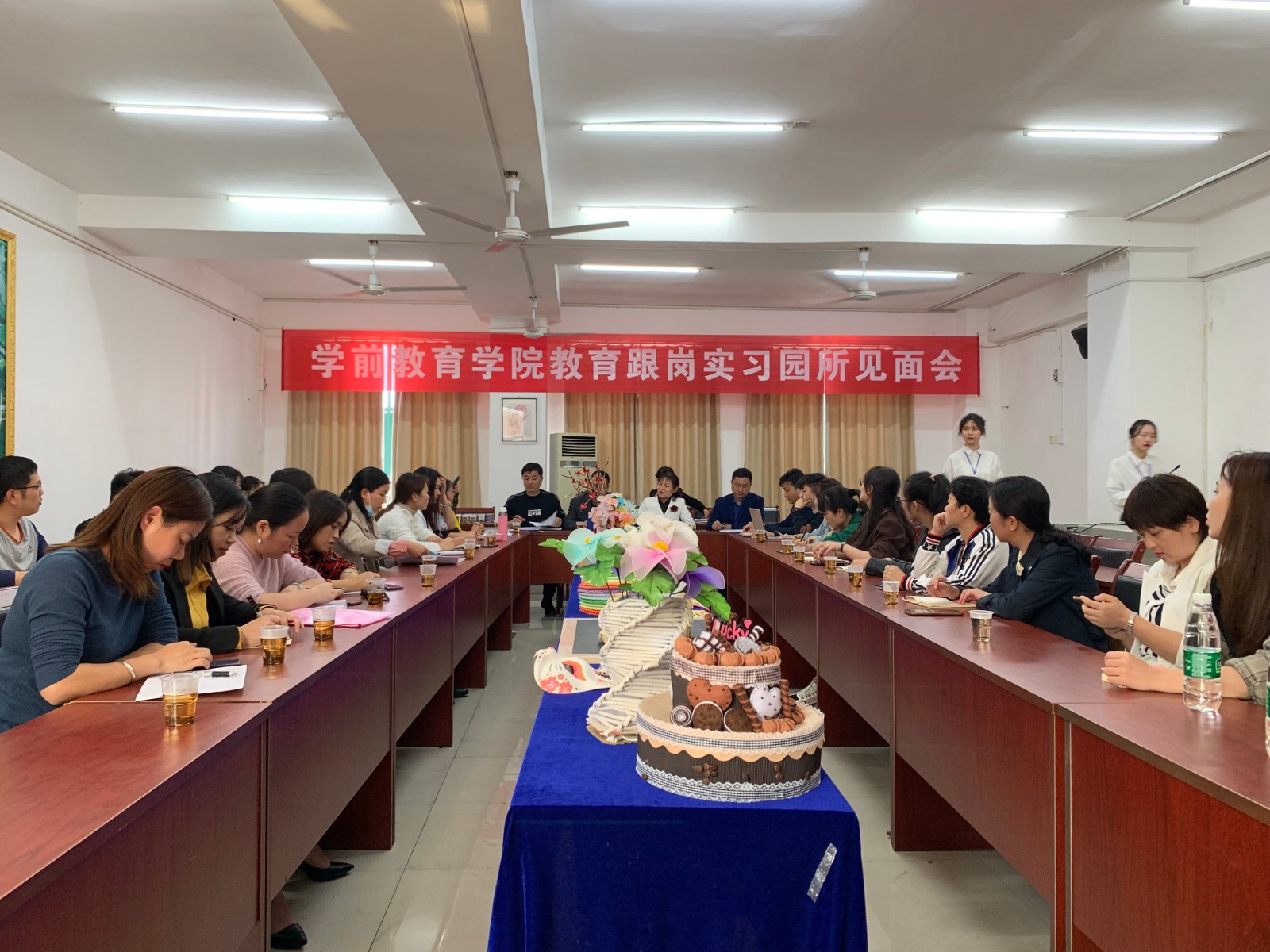 会议分为四个议程:一、刘凤英院长介绍此次实习情况;二、幼儿园代表发言;三、谢耀华书记发言;四、教务处处长史凌云发言;五、党委委员王国昌副校长发言。六、幼儿园与带队教师进行交流。