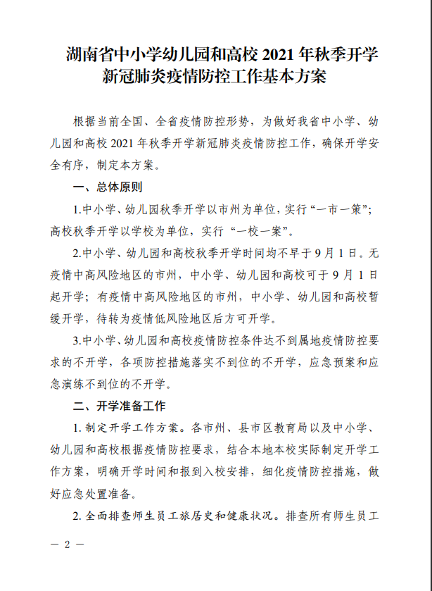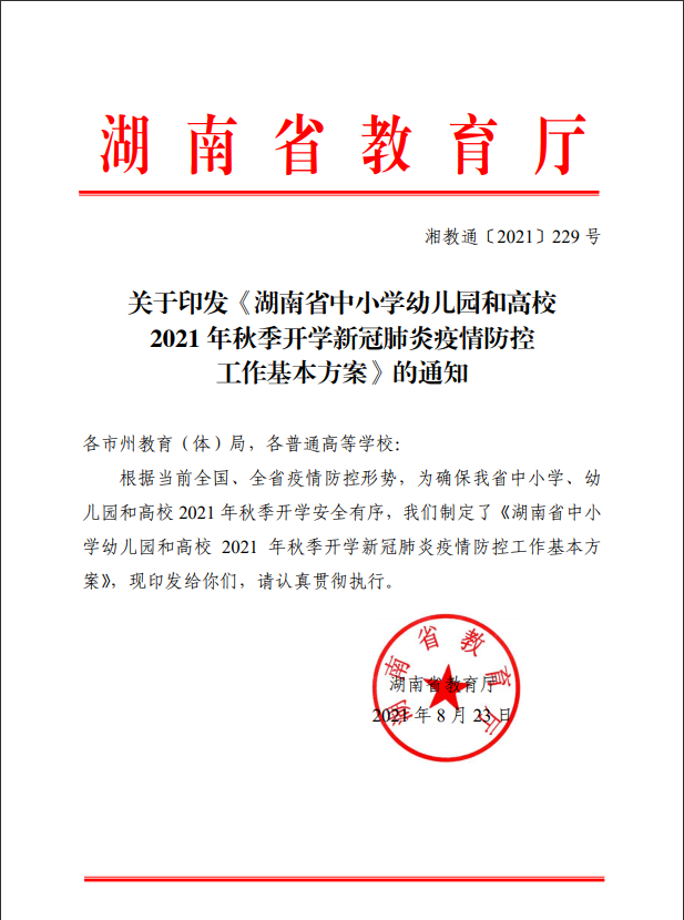 转发 《湖南省教育厅关于印发<湖南省中小学幼儿园和高校2021年秋季开学新冠肺炎疫情防控工作基本方案>的通知》