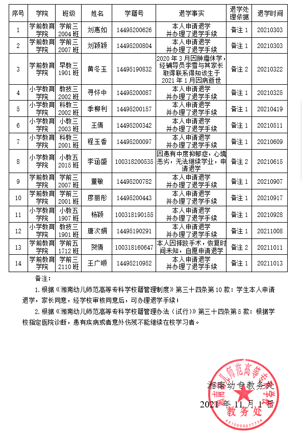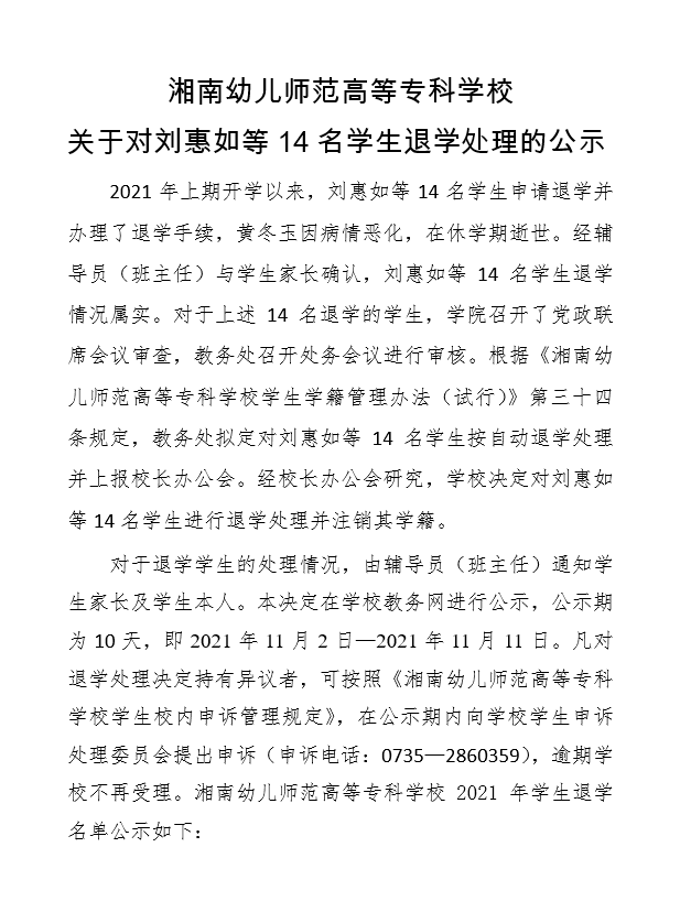 湘南幼儿师范高等专科学校关于对刘惠如等14名学生退学处理的公示