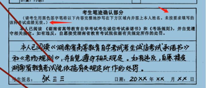 2.完成课程笔迹确认信息采集内容填写。考生须在答题卡指定位置认真完整抄写“考生笔迹确认部分”内容,并签名(抄写样例如下图)。省教育考试院将采集此处的抄写内容作为考生笔迹信息,并随课程成绩记入考生考籍档案。凡未完整抄写规定内容、字迹不清晰或未签署本人姓名,该课程考试成绩无效。