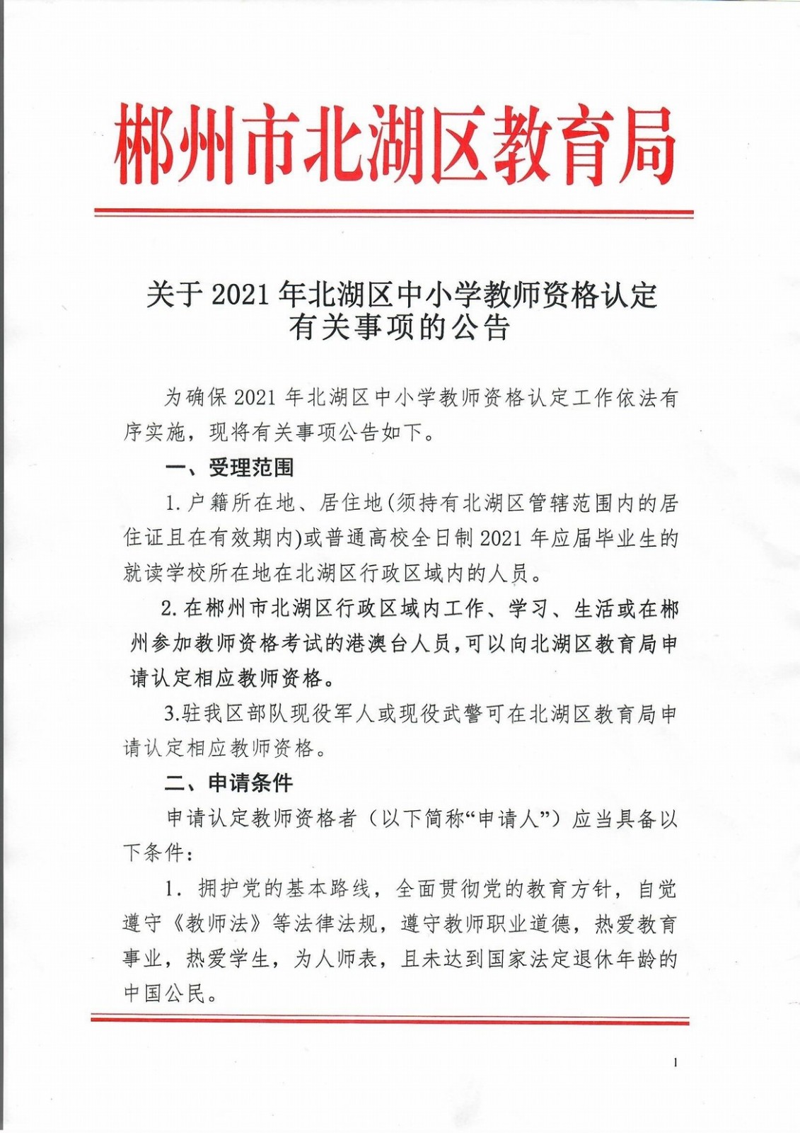 关于2021年北湖区中小学教师资格认定有关事项的公告
