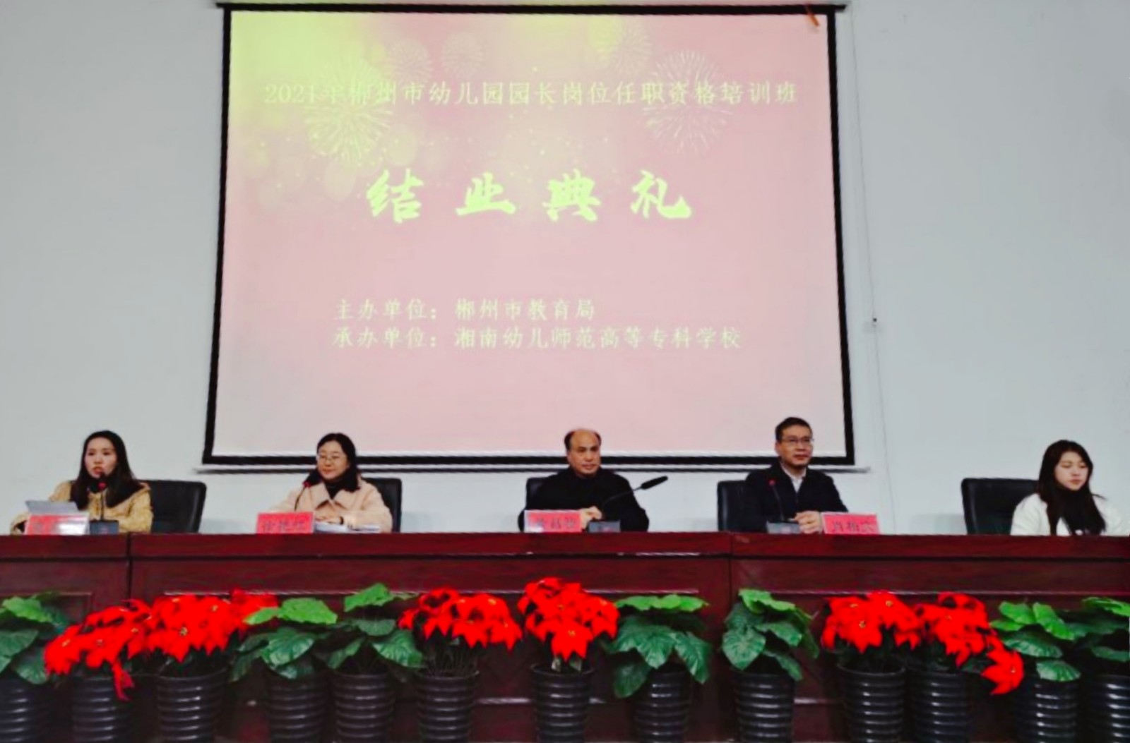 10月21日,2021年郴州市幼儿园园长岗位任职资格培训班结业典礼在郴州市电视广播大学实训楼举行。结业典礼由湘南幼儿师范高等专科学校继续教育学院副院长徐艳虹主持,湘南幼儿师范高等专科学校副校长黄昌祯、湘南幼儿师范高等专科学校继续教育学院院长肖柏文、湘南幼儿师范高等专科学校继续教育学院培训班班主任刘晓晶及2021年郴州市幼儿园园长岗位任职资格培训班110名学员参加结业典礼。